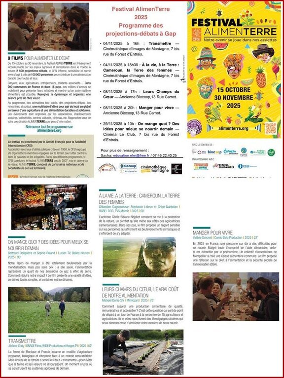 Le festival ALIMENTERRE a vu le jour en 2007 dans un cinéma parisien. Depuis, il est devenu un évènement international sur l'alimentation durable et solidaire organisé chaque année du 15 octobre au 30 novembre. Autour d'une sélection de films documentaires, il amène les citoyens à s'informer et comprendre les enjeux agricoles et alimentaires en France et dans le monde, afin qu'ils participent à la co-construction de systèmes alimentaires durables et solidaires et au droit à l'alimentation.