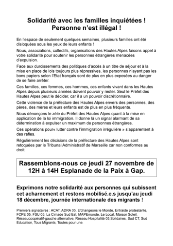 Rassemblement Solidarité avec les familles inquiétées ! Personne n'est illégal !